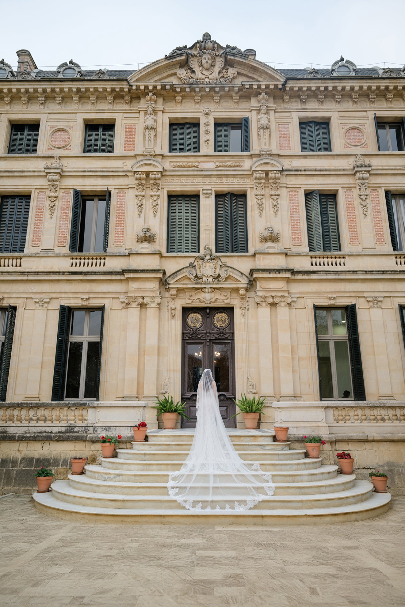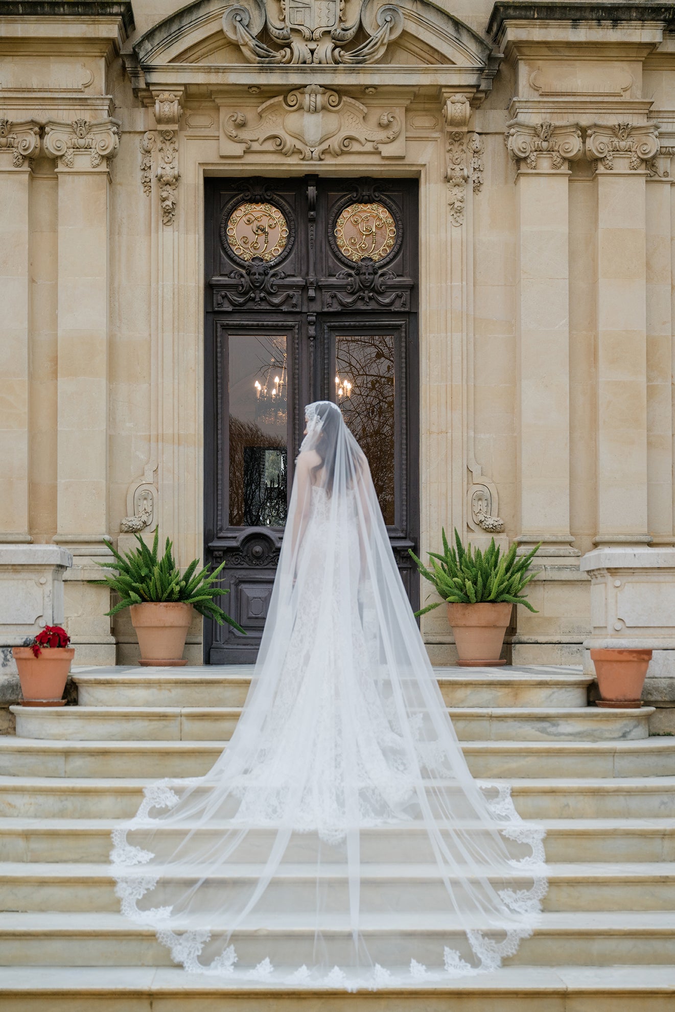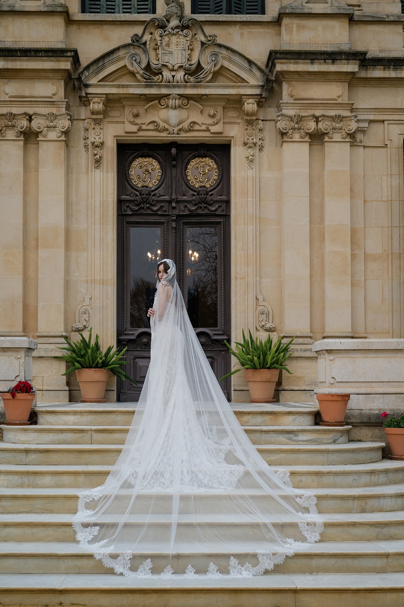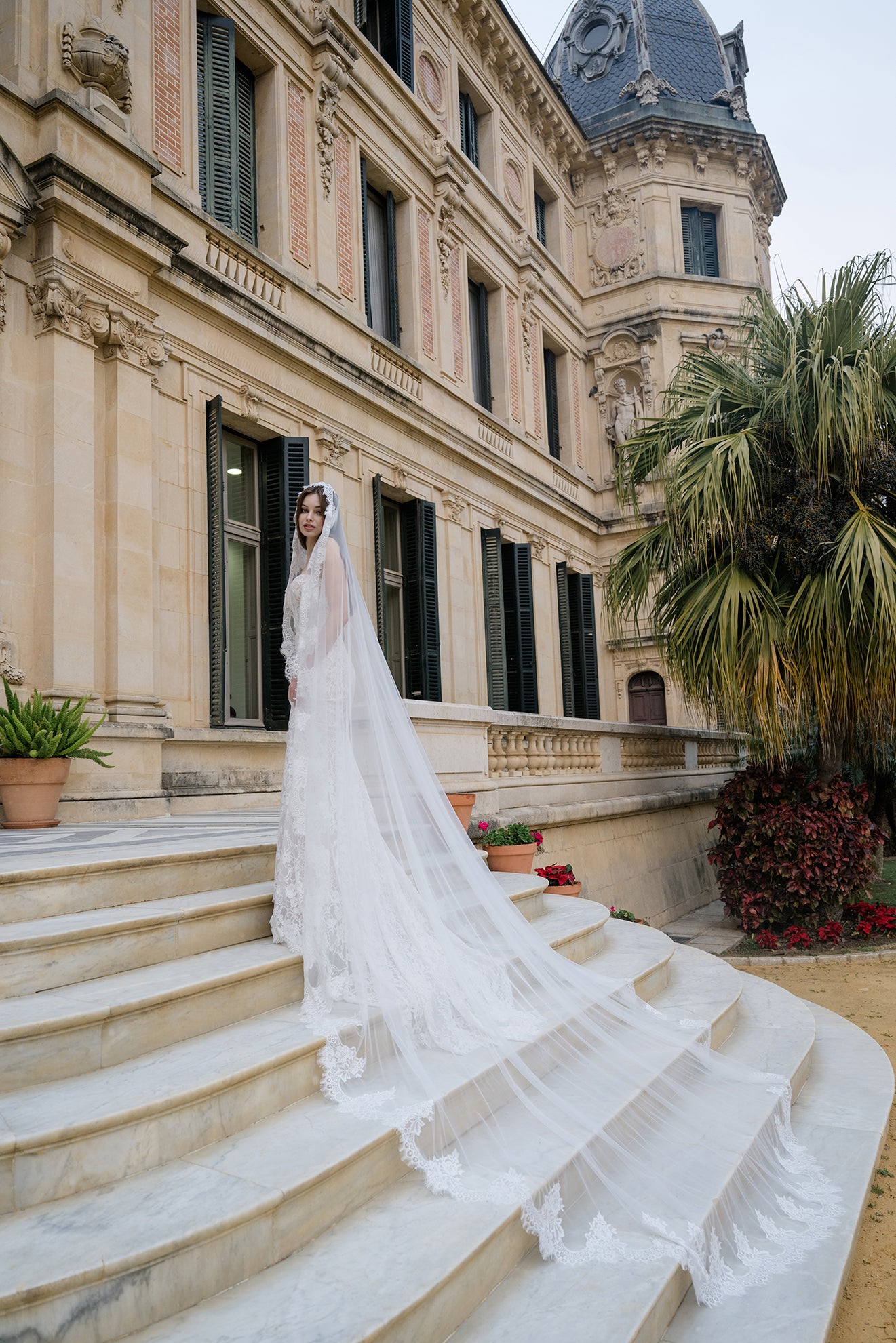 This cathedral-length Mantilla veil channels Spanish-inspired elegance, edged in scalloped eyelash lace for a dramatic, romantic finish. Designed to complement the bold lace detailing of styles E582, E583, and E584, it frames the face and gown in soft, vintage-inspired texture—perfect for a bride seeking timeless impact with a touch of heritage. Read Less
