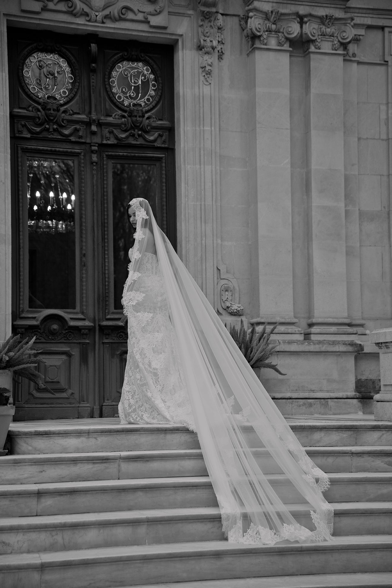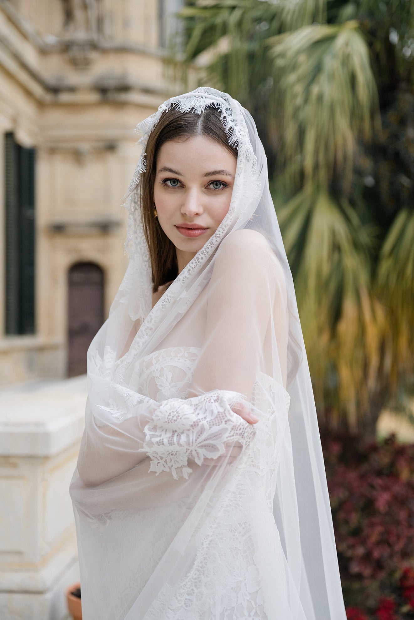 This cathedral-length Mantilla veil channels Spanish-inspired elegance, edged in scalloped eyelash lace for a dramatic, romantic finish. Designed to complement the bold lace detailing of styles E582, E583, and E584, it frames the face and gown in soft, vintage-inspired texture—perfect f... Read More