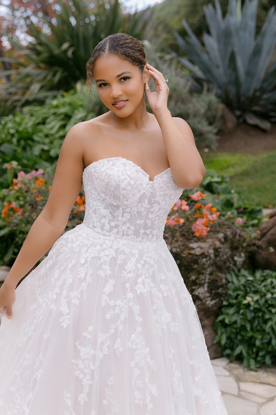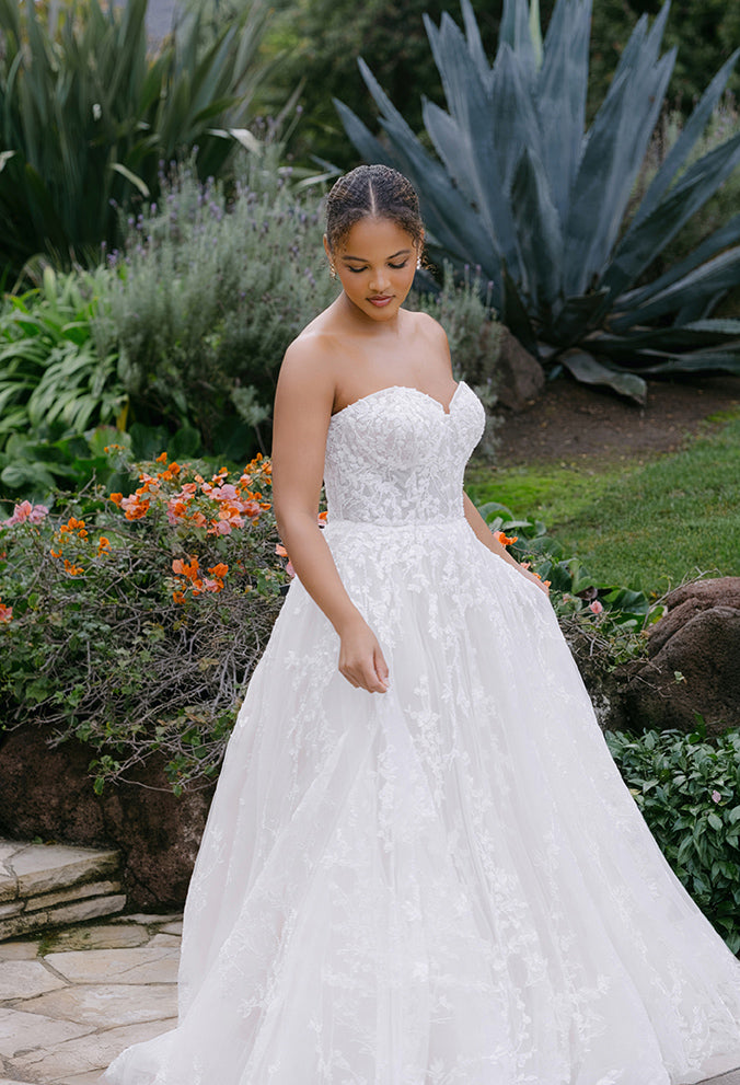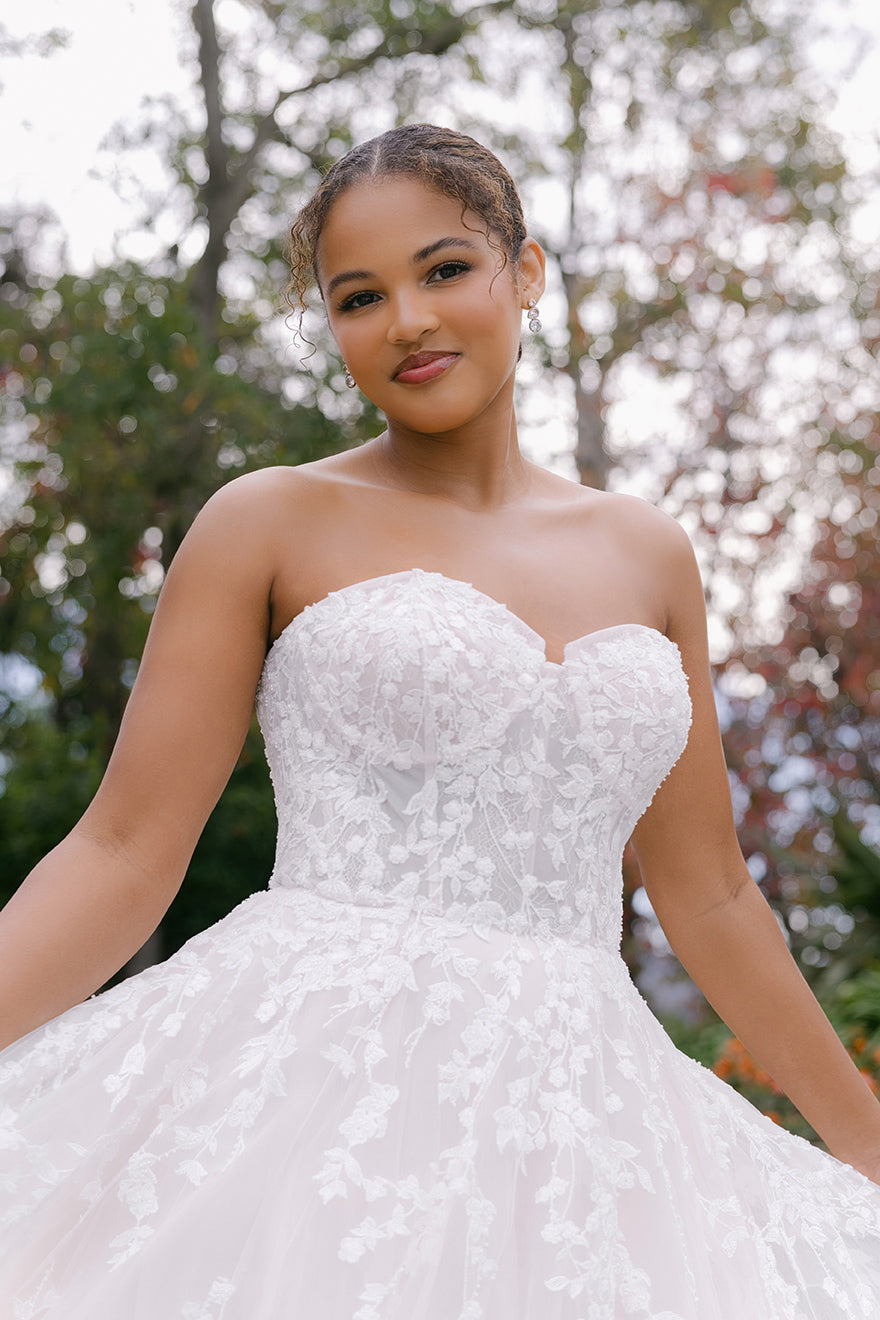 Beaded and sequined lace winds and twirls along the tulle ballgown silhouette of this strapless sweetheart gown.