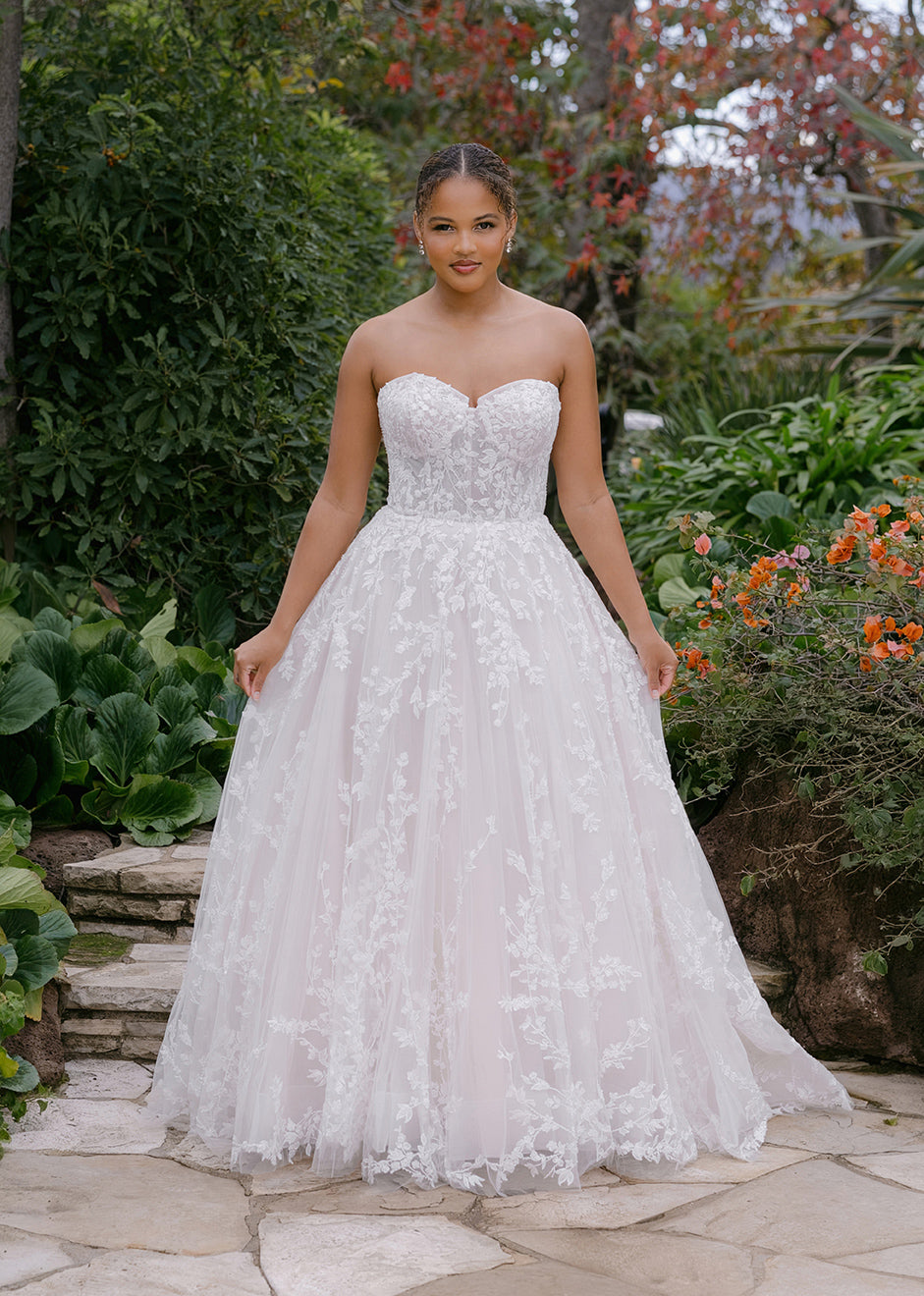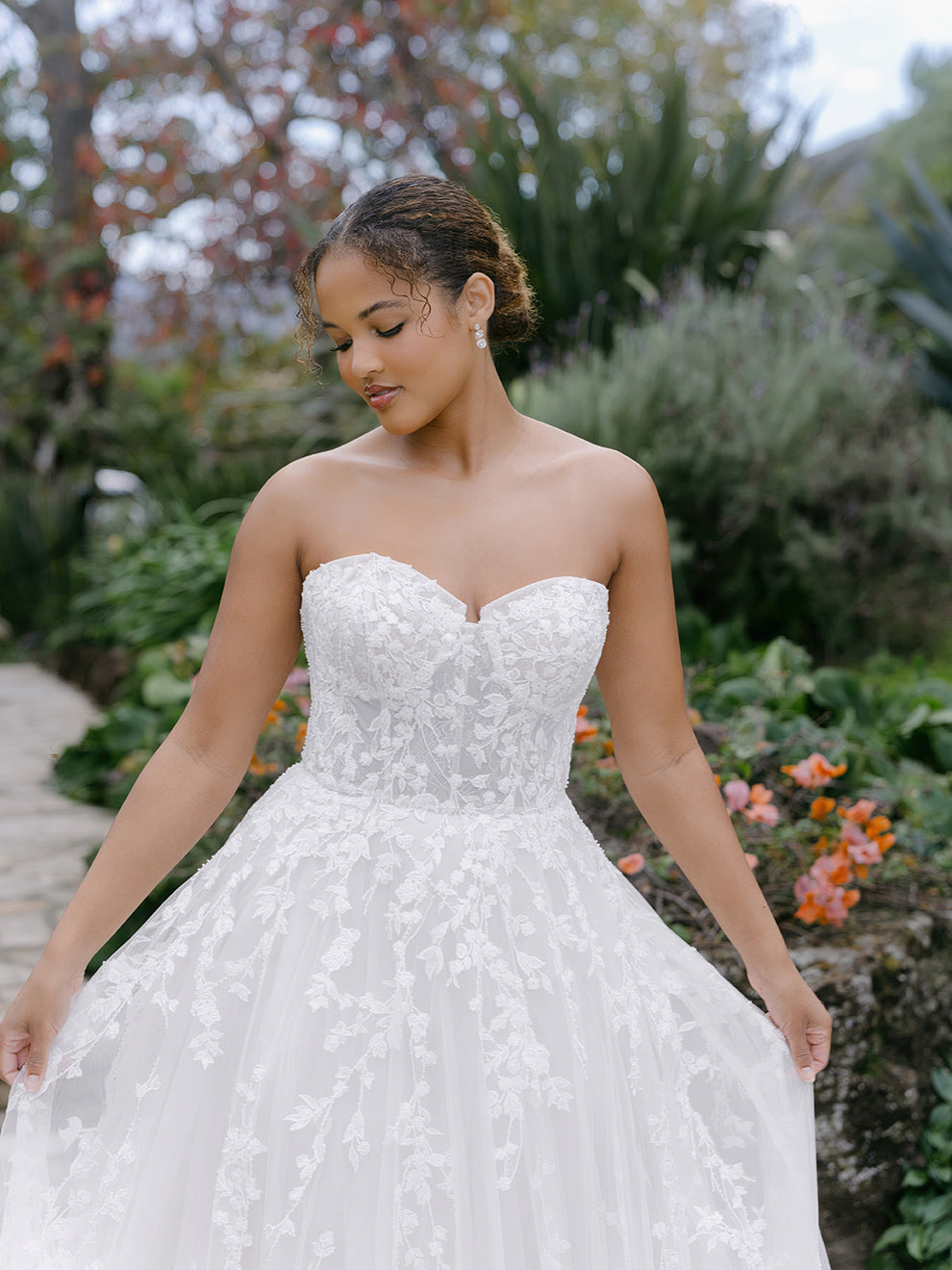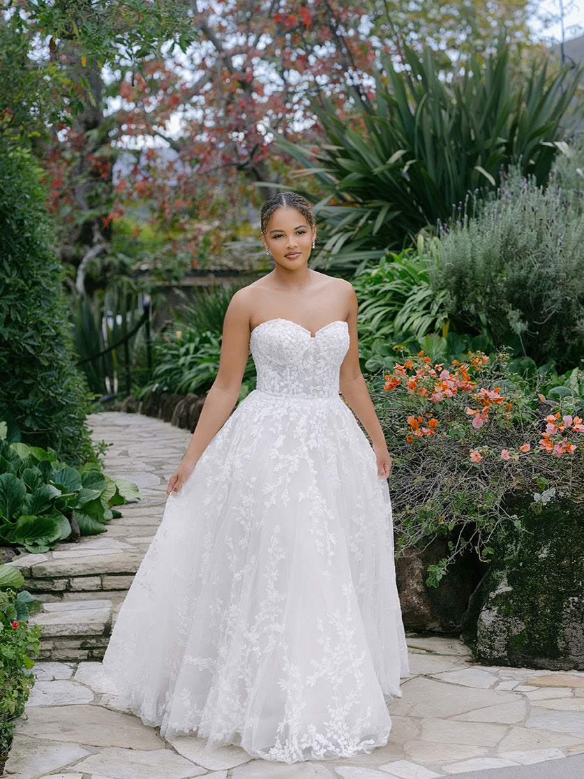 Beaded and sequined lace winds and twirls along the tulle ballgown silhouette of this strapless sweetheart gown.