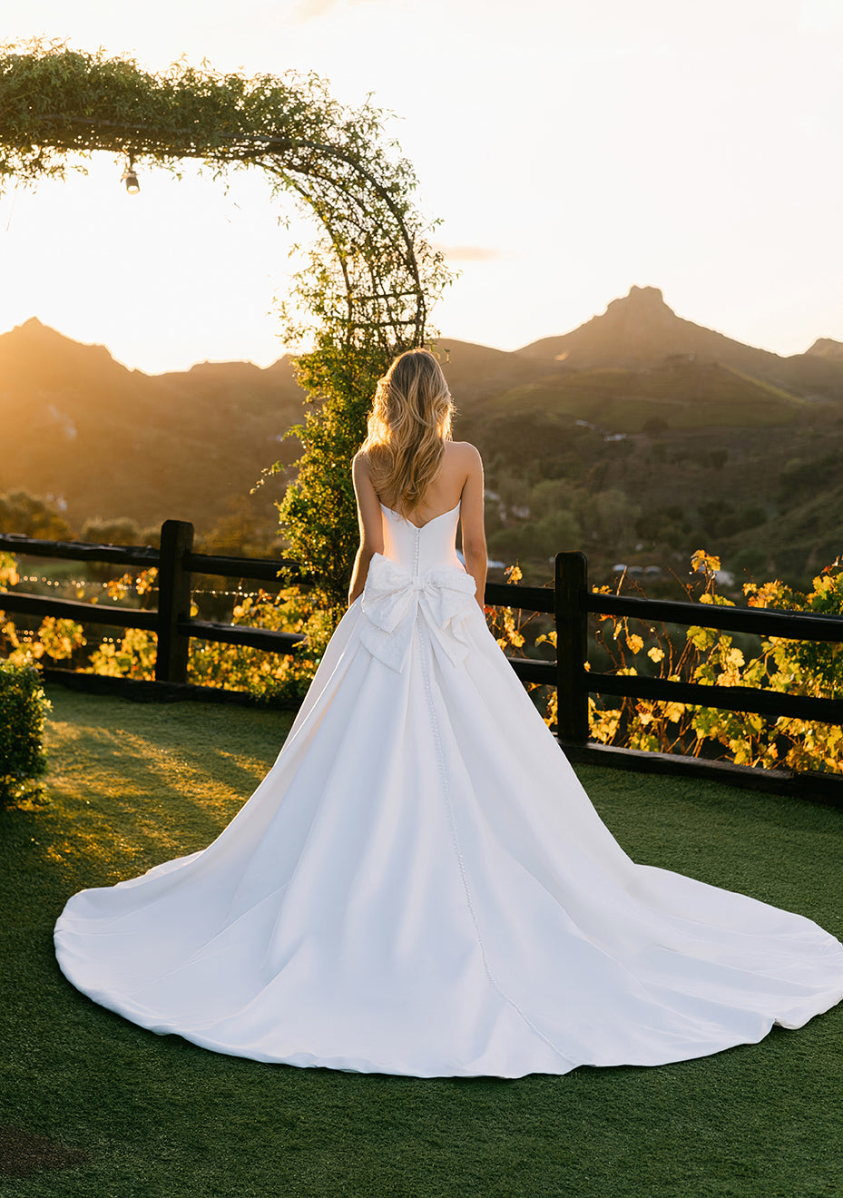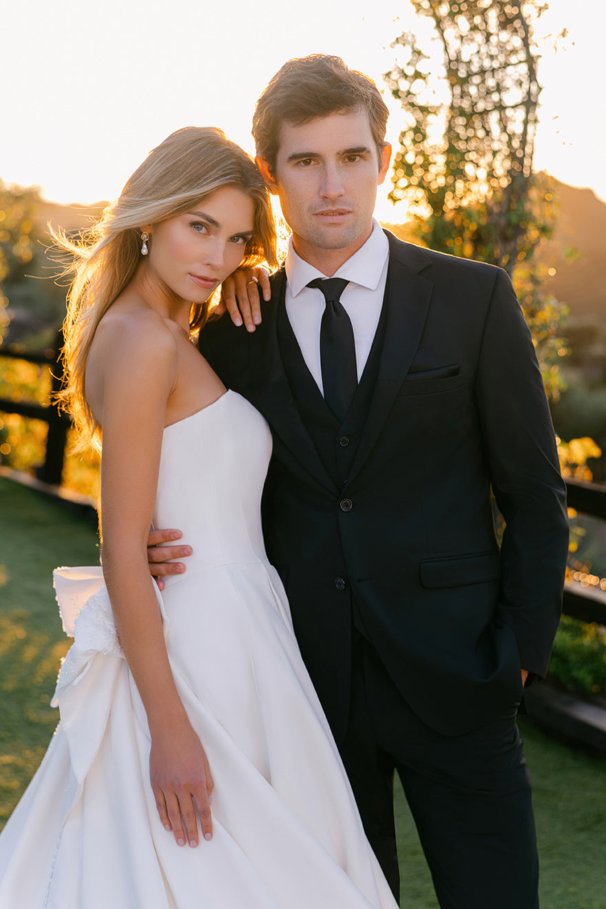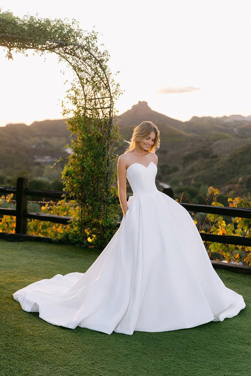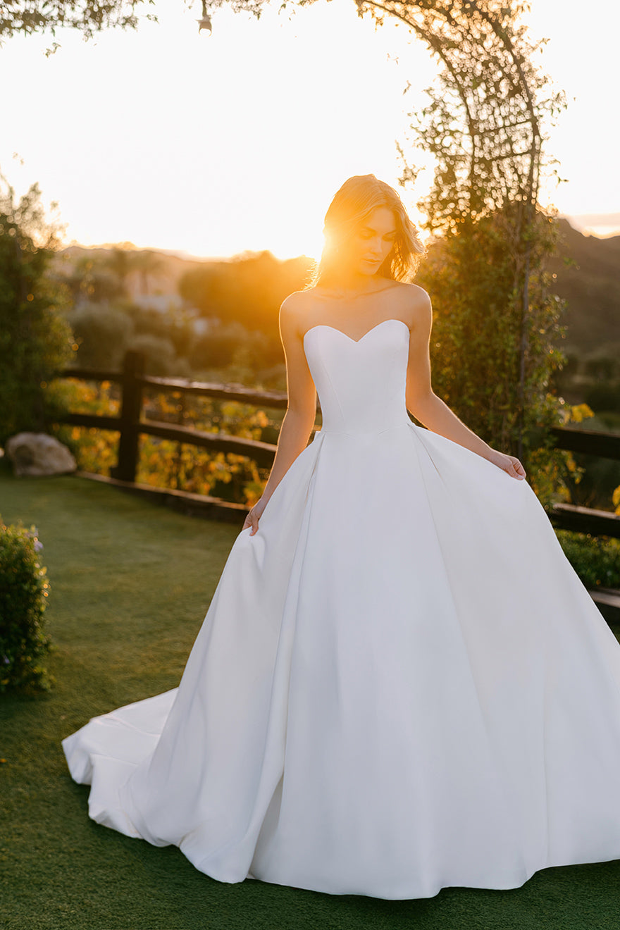 Subtly adorned with a detachable beaded crepe bow and basque waist, this strapless satin ballgown is both undeniably classic and utterly romantic.
